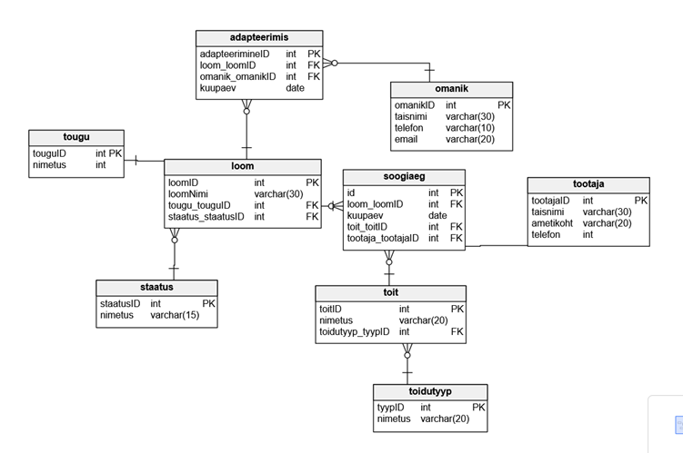 Andmebaasi füüsiline skeem loomade varjupaik :
