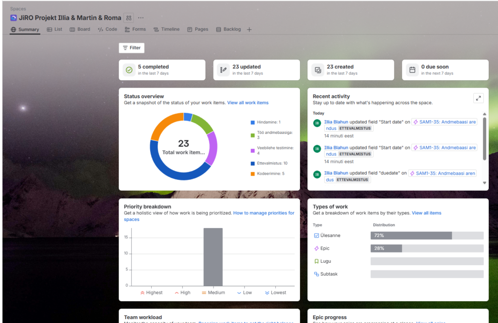 Näitab projekti üldist ülevaadet, sealhulgas ülesannete seisu, statistikat ja progressi. Võimaldab kiiresti hinnata projekti hetkeseisundit.