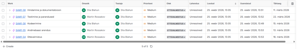 Kuvab kõik projekti ülesanded loendi kujul. Võimaldab filtreerida, sorteerida ja kiiresti muuta ülesannete andmeid.