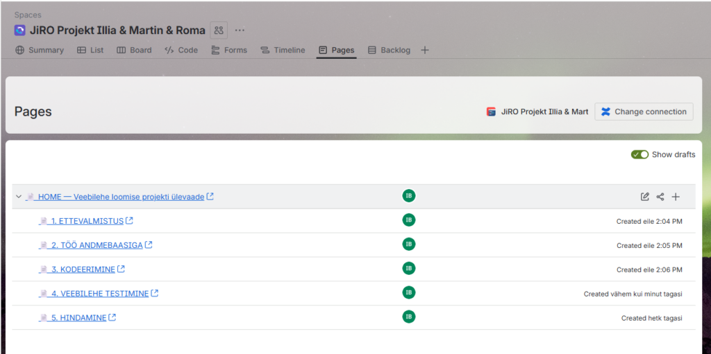 Confluence’i lehed, kus hoitakse projekti dokumentatsiooni, kirjeldusi ja lisainfot. Võimaldab siduda Jira ülesandeid dokumentatsiooniga.