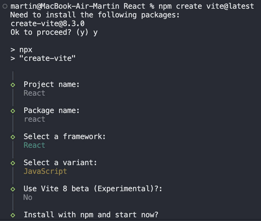 We must install the necessary packages, write the name of our project, and be sure to select the “React” framework and the “JavaScript” option.