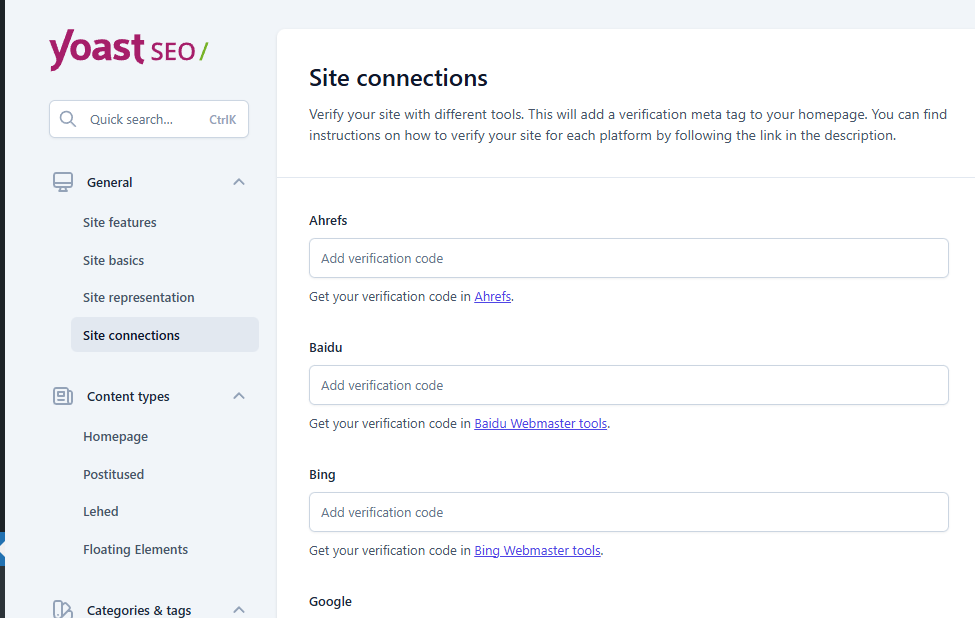 - SEO plugini seadistused, kasutame verifitseerimiseks Google Search Konsooli